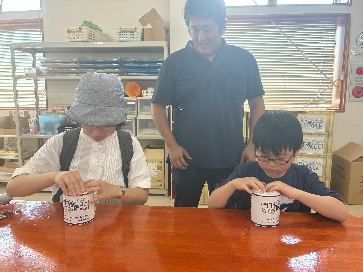トイレットペーパーを包装紙で包む作業を、親子参加のお二人に体験してもらいました。「きれいに包むのが難しい…」と言いながら無事に完成。トイレットペーパーはお土産としてプレゼントしていただきました。