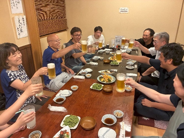 終了後は十日町駅近隣のお店まで送っていただき、懇親会。グループホームの管理者を務める果奈子さんも合流してくださいました。お店に入ると、会長のお知り合いの方がいらっしゃったのですが、お昼を食べに行ったお店でも偶然、あんしんの職員さんのご家族と遭遇していました。あんしんのみなさんがまちに溶け込んでいることを改めて実感しました。
