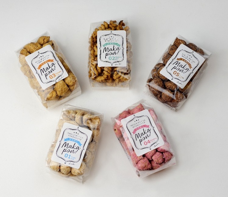 マカロニをポン菓子機にかけ、加熱・加圧を解放させる時の大きな音とともにはじけ、生まれるお菓子です。