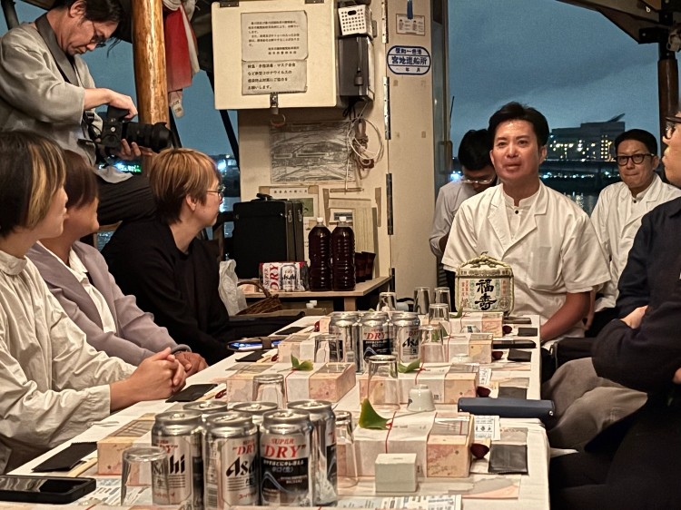 そして、昨夜は新たな試みとして、食べ物の飲み込みが難しい方も健常者も一緒に楽しむ嚥下食の船遊びを開催しました。昨年のミライの参道まるけがご縁で、カムカムスワロー(近石病院が運営する嚥下食も提供するカフェ)のみなさん、やわらか和食の口福膳を作られている日本料理関西さんと一緒に実現した船遊びです。