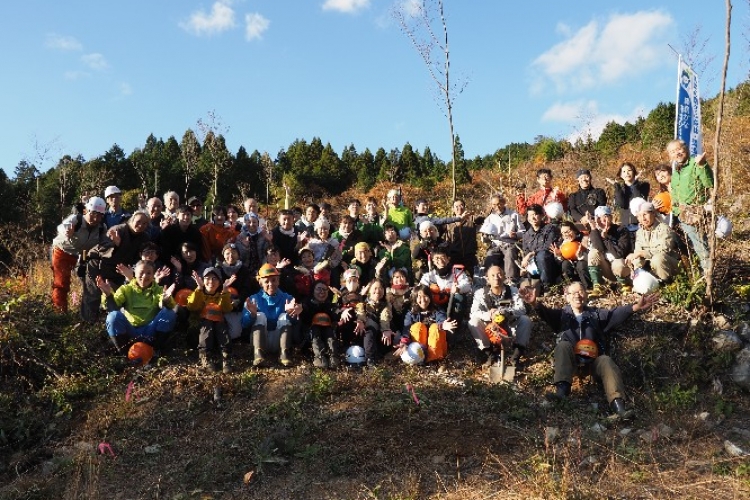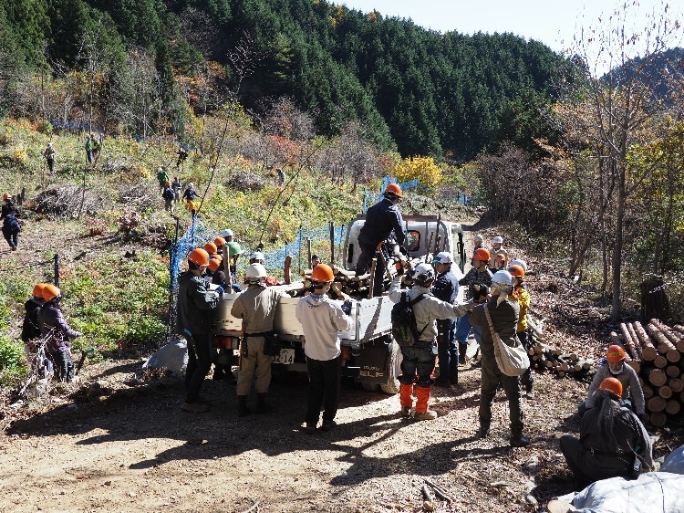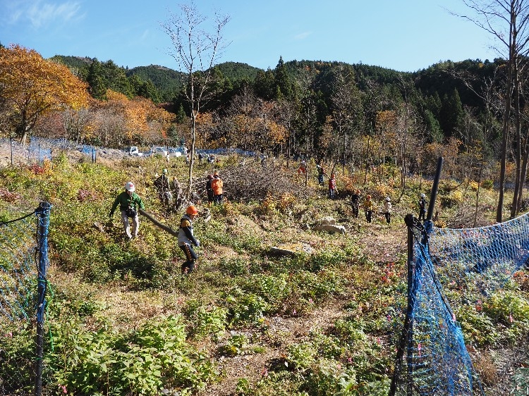 実行委員の挨拶と概要説明などがあり、午前はエゴノキの収穫、午後はエゴノキの苗の植樹と作業が進みます。私は昼休憩のきのこ汁づくり担当になったので、山仕事は午後からでした。事前に実行委員のみなさんが決めてくださった班ごとにわかれて持ち場へ。今年はお天気にも恵まれ、みんなで声を掛け合いながら笑顔で作業が進んでいました。
