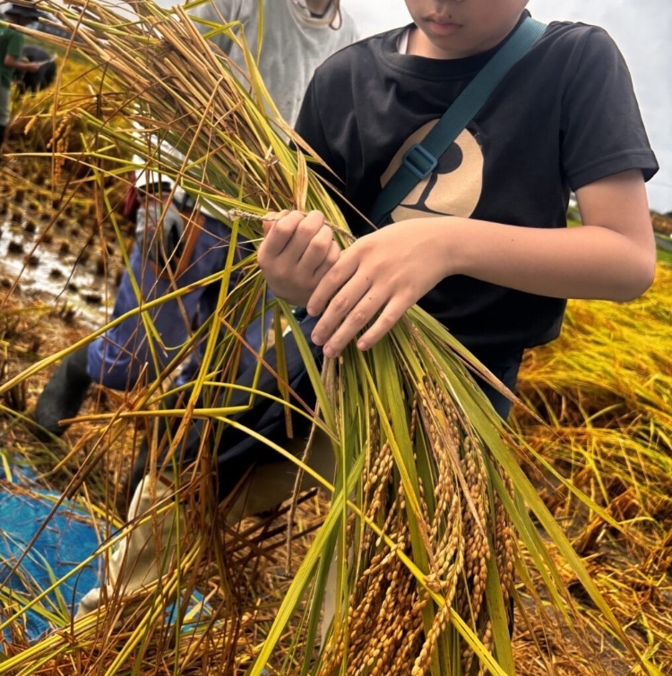 鎌を持つ手を休めずにどんどん刈り進める子、反対側の仲間と「道を作ろう!」と工夫して進める子。刈った稲を麻紐でまとめたり、重たい束をトラックまで運んだりと、それぞれが力を合わせ、最後まで一生懸命取り組んでいました。達成感にあふれた表情は、とても印象的でした。