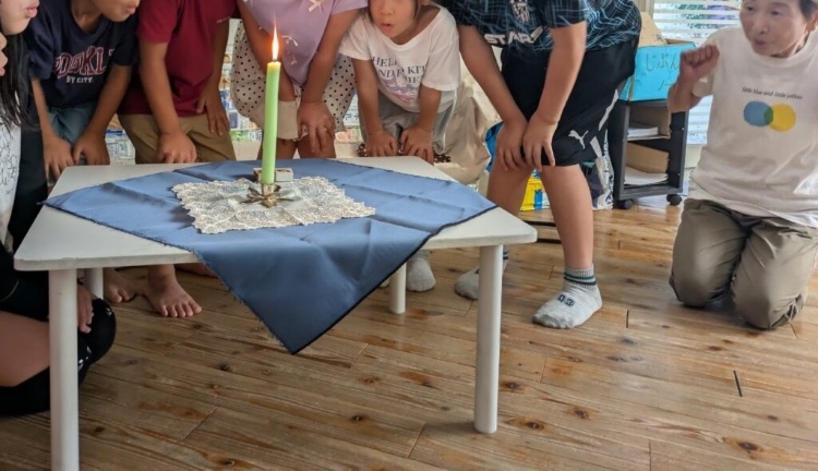 おはなしが終わると、ろうそくを吹き消すのは誕生日が近いこどもたち。「今月はぼくが前に出る番だ♪」と、毎月の小さな楽しみになっています。他のこどもたちも願いごとを心に浮かべながら、その瞬間を一緒に見届けています。