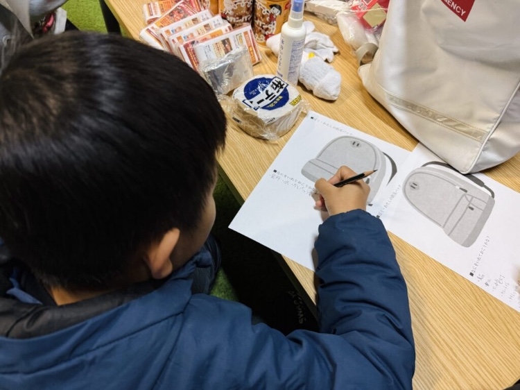 防災グッズDAYでは、校舎にある防災バッグの中身を確認しながら、「自分の防災バッグを作るとしたら何が必要か」を考え、最後にはこどもたちが楽しみにしていた非常食の試食も行いました。