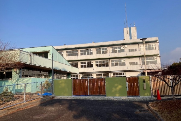 利用する中学校の敷地が広すぎるので、小学校に必要な敷地をアメリカンフェンスで区切り、正門を設置しました。