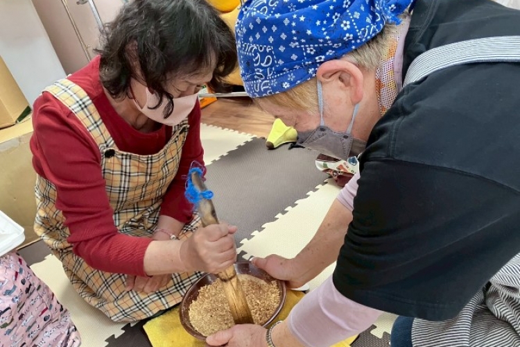 ボランティアの方がすり鉢ですってくださったクルミや黒ゴマをはじめ、みたらし、納豆、あんこ、きなこなど、いろいろな味を用意して