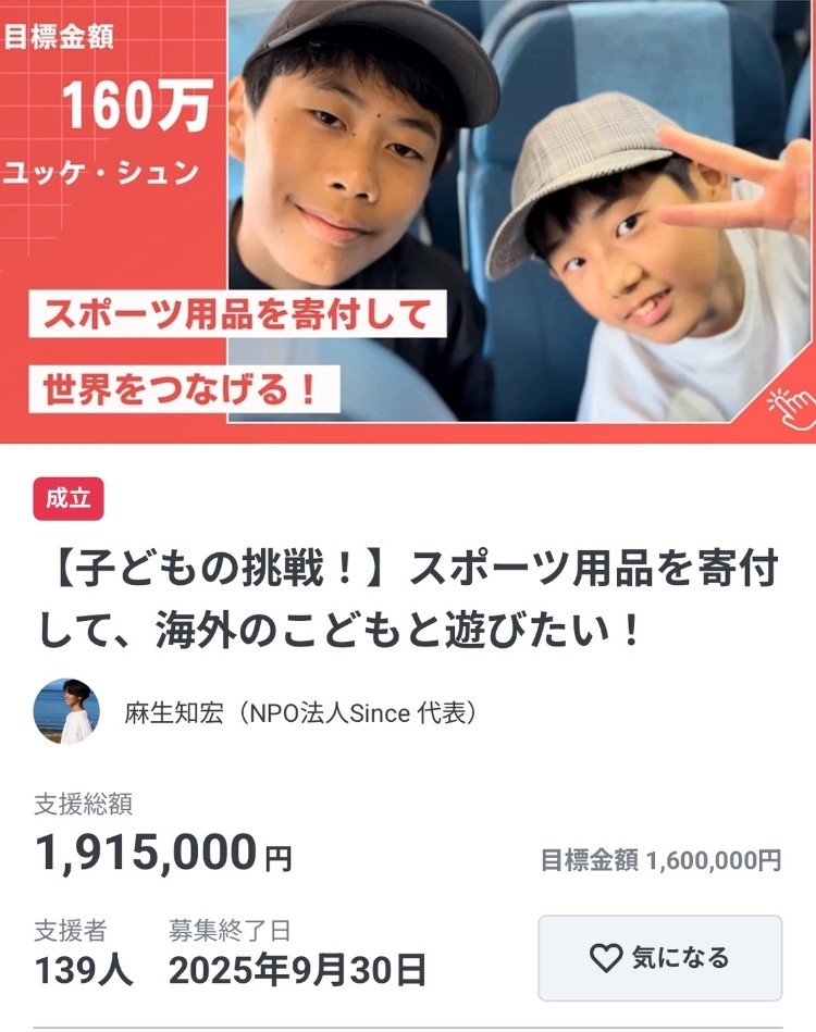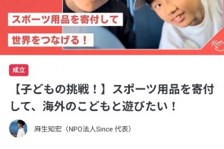 既にご存じの方もいらっしゃるかと思いますが、海外の孤児院にスポーツ用品を届けるプロジェクトに係るクラウドファンディングですが、無事目標金額の160万円を達成することができました。