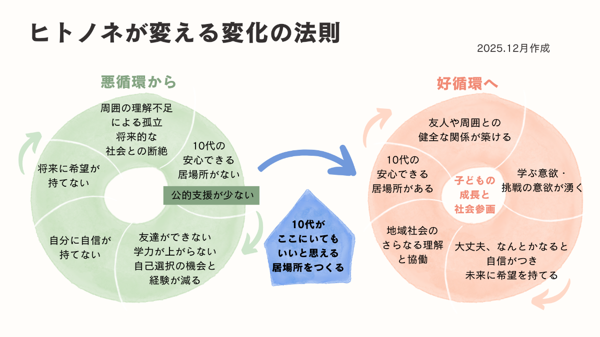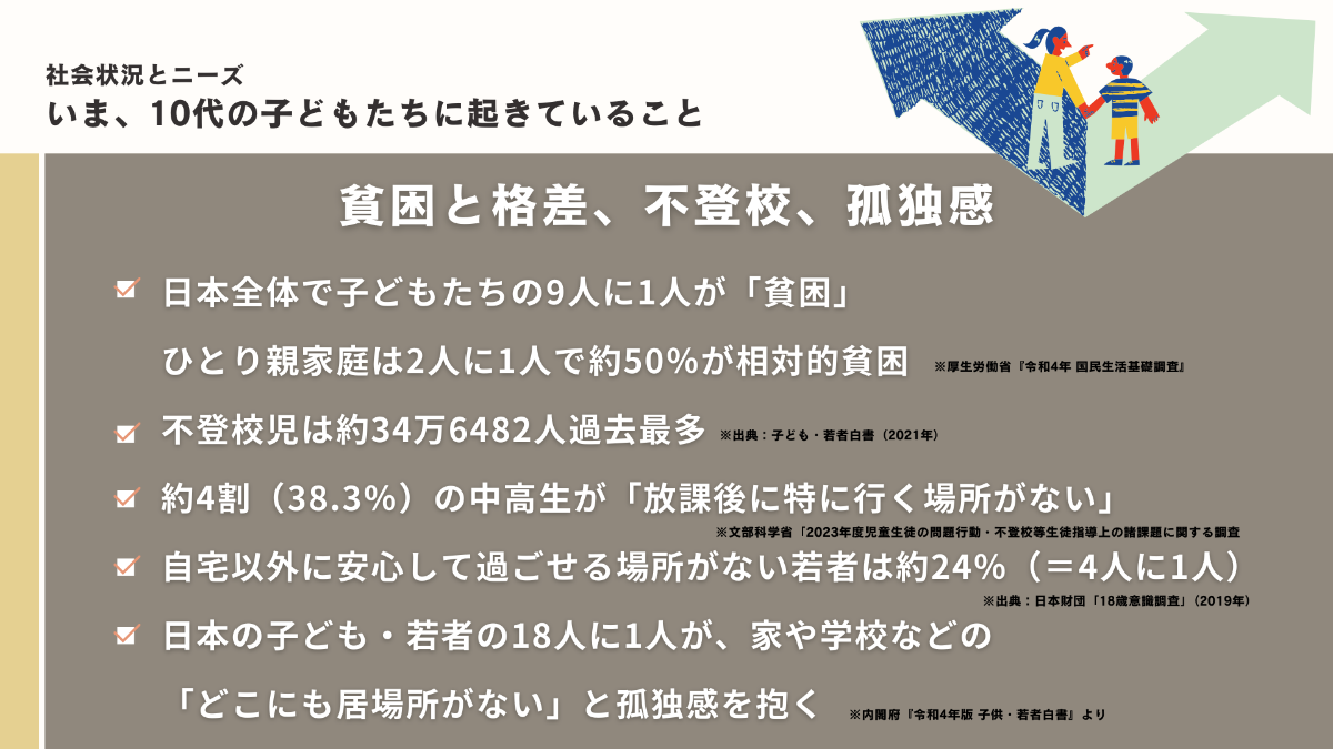また、子どもの自殺の中でも特に10代が最も多く、子どもたちは孤立感を抱いています。社会が子どもをそんな状態に貶めていて、これは深刻な問題です。10代の居場所こそ、”子どもの声を聞く大切な装置”として機能すべきです。だからこそ、子どもたちが「ここにいてもいい」と心から感じられる居場所を提供し、学びや挑戦を通して成長を支え、地域社会の理解と協力を育むことが必要です。