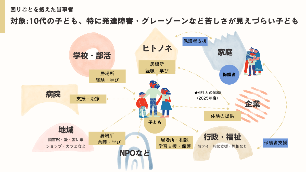 困り感を抱える10代、とくに発達障害や学習障害、グレーゾーンなど苦しさが見えづらい子どもたちを支えるには、支援者だけでは力が足りません。子どもたちは家庭・学校・地域・行政・企業という多層的な関係の中で生きており、不登校や引きこもりの状態にある子は、家庭だけでも学校だけでも本来の姿や必要な支援は見えにくいのです。