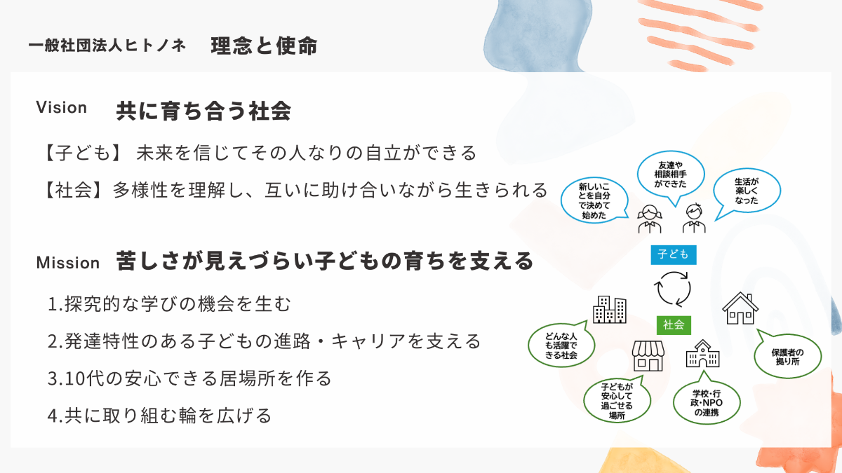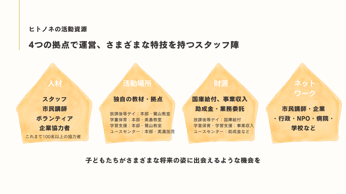 一般社団法人ヒトノネ代表の篠田です。ヒトノネは、「共に育ち合う社会」をモットーとして、岐阜県で小学生から高校生の子どもたちやその家庭が安心して過ごせる居場所を提供しています。具体的には、学童保育、放課後等デイサービス、学習支援、10代の居場所(ユースセンター)を運営しています。