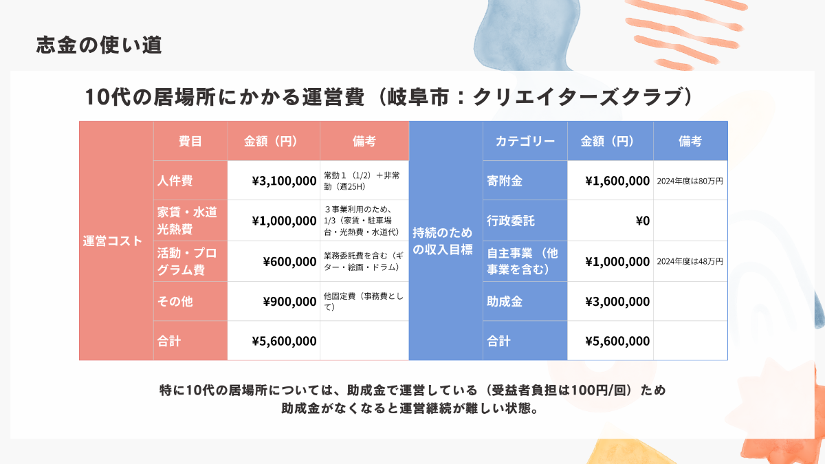 これまで、このユースセンターはNPO法人カタリバの助成(年間500万円)と伴走に支えられて運営されてきましたが、2025年度で終了し、以降は自主運営が必要になります。“志金”は、この居場所を継続するための人件費や家賃、活動費など、子どもたちが安心して過ごせる環境づくりに大切に使わせていただきます。